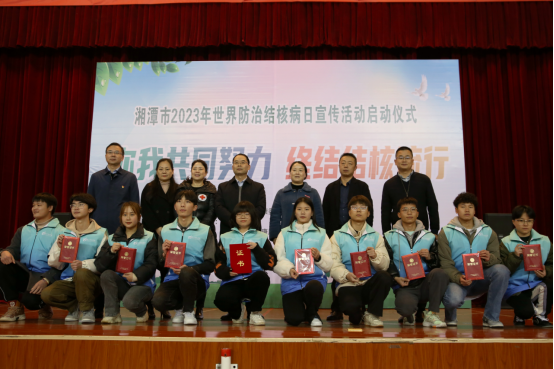 仪式现场还为“全国优秀志愿团队”及2022年度湘潭市高校“优秀志愿者”颁发了表彰证书,同时,为五所高校志愿者代表颁授了百千万志愿者结核病防治知识传播行动队旗。