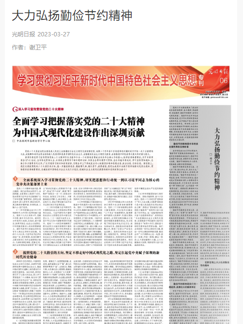 3月27日,《光明日报》“学习贯彻习近平新时代中国特色社会主义思想”专刊发表了365官网马克思主义学院谢卫平教授署名的理论文章《大力弘扬勤俭节约精神》。