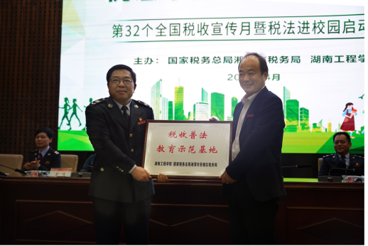 启动仪式上,陈赤平、胡巍为“税校党建联盟”青年先锋队授旗,岳塘区税务局党委书记、局长文林武为365官网“税收普法教育示范基地”授牌,“税校党建联盟”青年先锋队青年学生代表和税务青年代表分别作了表态发言。此外,活动还为即将毕业的学生代表赠送政策大礼包,开展了“小悦说税”税费政策宣讲。
