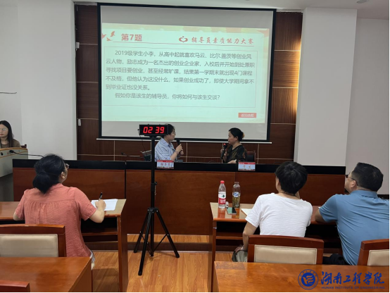 比赛坚持“以赛代练、以赛促学”导向,内容包括基础知识、描述定位、案例研讨和谈心谈话四个部分。基础知识部分采用闭卷方式作答,集中考察辅导员的理论素养与业务知识。描述定位部分主要考察对学生的熟悉程度,比赛中辅导员需要根据学生基本信息中的任意三条准确答出学生姓名。案例研讨部分,辅导员以“我提问,你回答”的方式共同展开研讨,针对学生学业困难、心理健康、人际交往、思想政治教育等热点难点问题,抓关键,辩思路,寻对策,对案例中的事件进行剖析、解读和研判。谈心谈话部分,辅导员们根据案例场景,以情景再现的方式与“同学们”展开一对一谈心谈话,共情互动,针对不同情况给予个性化建议和指导,帮助学生解决实际问题。