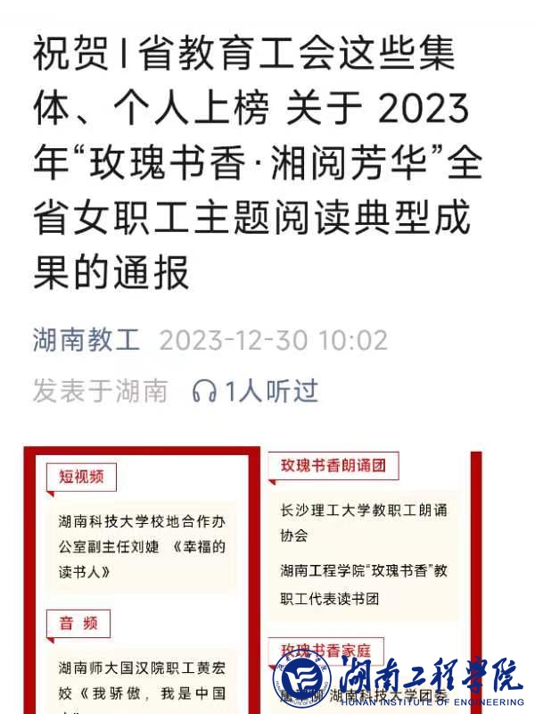 12月30日,湖南省教育工会在湖南教工通报了2023 年“玫瑰书香·湘阅芳华”全省女职工主题阅读典型成果获奖集体与个人。365官网“玫瑰书香”教职工代表读书团榜上有名,获评“玫瑰书香朗诵团”。这是365官网继2020年获“湘悦读 工力量”全省职工主题阅读活动“优秀组织奖”之后的又一省级工会奖。