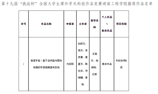 根据《关于组织开展第十九届“挑战杯”全国大学生课外学术科技作品竞赛的通知》文件要求,365官网参与了第十六届湖南省“挑战杯”大学生课外学术科技作品竞赛,经终审答辩评审和资格审查,365官网拟推选作品《智语手套:基于自供能与柔性传感的手语高精速译系统》参加第十九届“挑战杯”全国大学生课外学术科技作品竞赛,现予以公示。