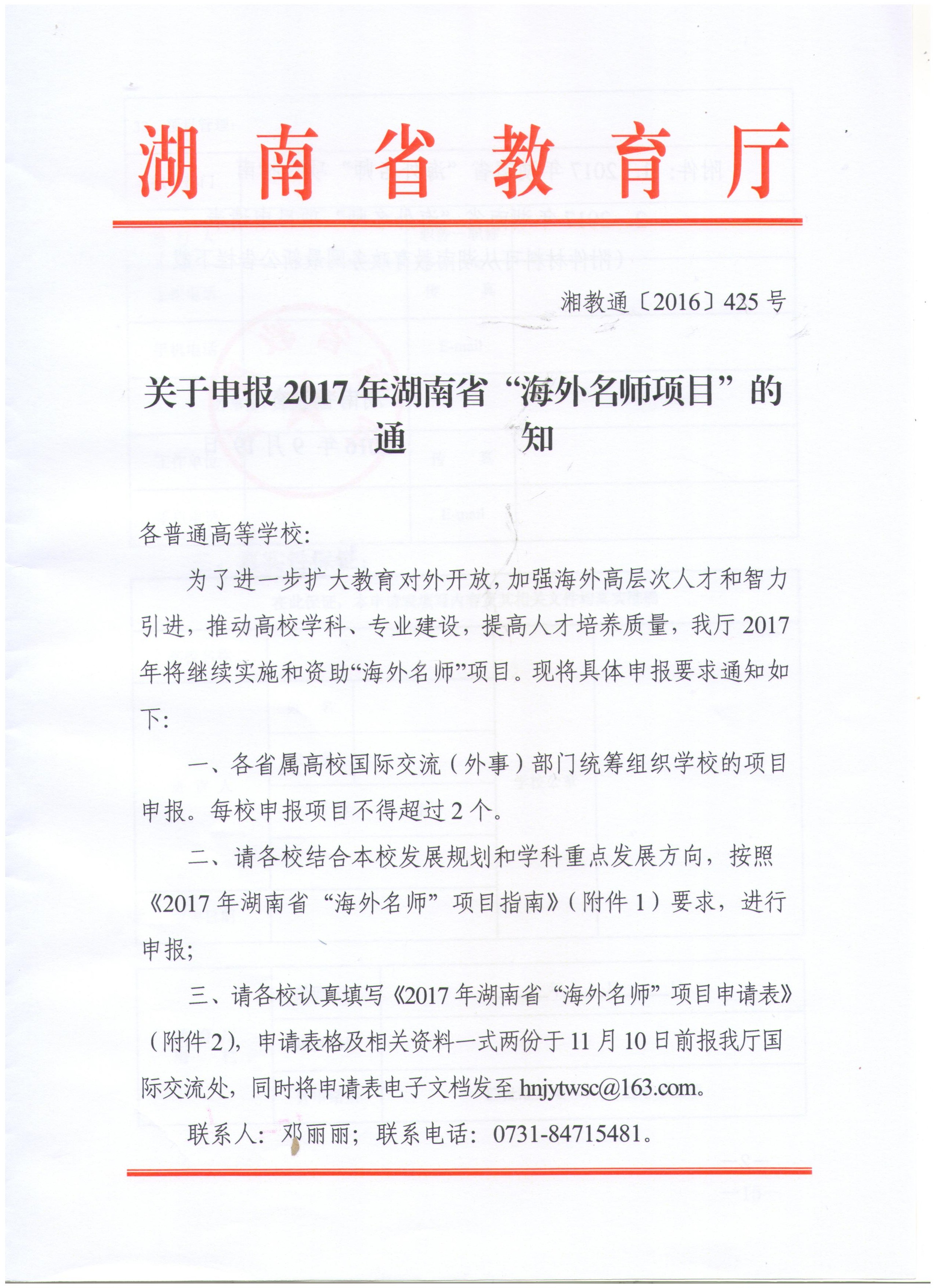 为了进一步扩大教育对外开放,加强海外高层次人才和智力引进,推动高校学科、专业建设,提高人才培养计划,根据湘教通[2016]425号通知,湖南省教育厅2017年将继续实施和资助“海外名师”项目。现将具体申报要求通知如下: