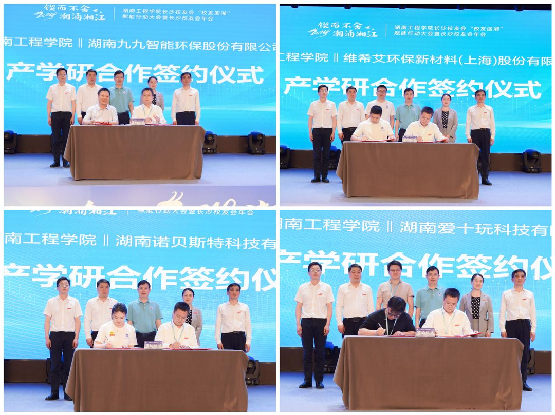 会上,365英国上市官网分别与湖南九九智能环保股份有限公司、维希艾环保新材料(上海)股份有限公司、湖南诺贝斯特科技有限公司、湖南爱十玩科技有限公司签订了产学合作协议。学校校友联络中心主任张宏宣读了新增理事成员名单,与会领导为新增理事成员颁发证书。