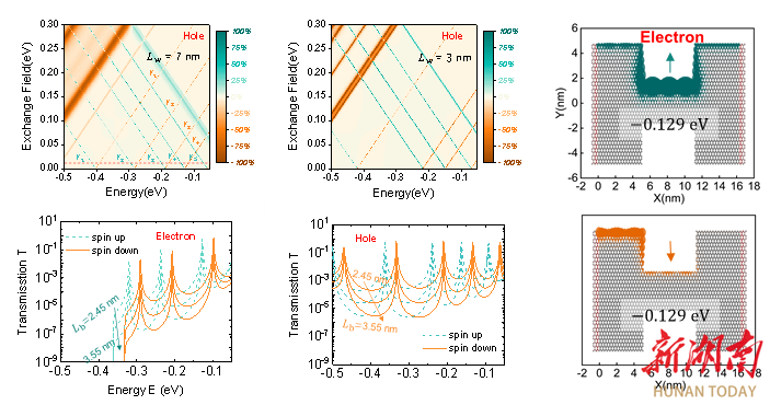 结果表明,在弱交换场下,该结构在电子与空穴输运中均可出现明显的自旋分裂共振峰和周期性自旋极化;随着交换场增强,自旋态能级分离进一步扩大,自旋滤波效率显著提升。该研究成果揭示了几何结构在调控自旋输运中的关键作用,为发展低功耗自旋滤波器、自旋逻辑门及其他量子器件提供了新思路。