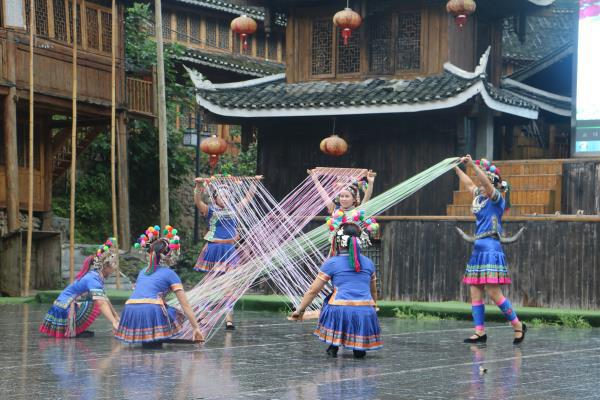 据苗寨村民介绍到,苗家人极为讲究礼节,喜、丧、宗教、节庆等都有各自的宗教。寨内女子的服饰及寨内风情吊脚楼是苗族文化不可或缺的内容,华美的苗族服饰和奇特的银饰,极大地发挥了苗族同胞的想象力和创造力。看到志愿者们的到来,正在进行民俗表演的姑娘们邀请志愿者们体验特色爬竹竿、踏踏板、高马脚等活动,体验苗寨民俗表演的乐趣。一位苗家阿妹表示,苗家服饰被称为“穿在身上的史书”,是因为女子的苗服制作过程十分精湛,种类也比较繁多。