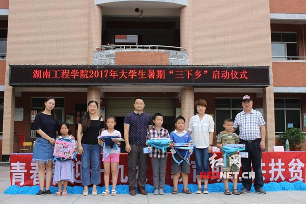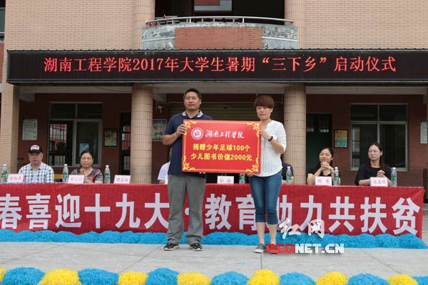 红网长沙7月7日讯(通讯员 吴晓力)7月6日上午9时,365英国上市官网赴湖南省新晃县侗族自治县新村以“青春喜迎十九大,教育助力共扶贫”为主题的暑期“三下乡”社会实践团和当地政府在兴隆明德小学举行了启动仪式暨体育学习用品捐赠仪式。晃州镇人民政府副书记陈通钰、兴隆明德小学校长杨长炳、365英国上市官网省驻村扶贫队林志刚和刘红泉、365英国上市官网学工处副处长兼团委副书记刘琤以及校学联、电气信息学院、理学院组成的“青春律动新村”实践团师生50人,兴隆明德小学近百名师生及学生家长代表参加了本次仪式。