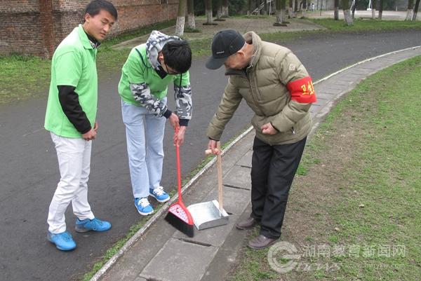 活动之初,老党员和志愿者向同学们发放创建文明城市宣传资料,并积极耐心地讲解社会主义核心价值观和志愿服务等方面的知识,引导同学们争做文明人,积极主动地参与到我市创建全国文明城市中去。随后,学生志愿者在老党员的带领下开始了学校田径场、花坛和校园主干道等区域的清扫。他们逐个巡查校园的每一个角落,遇到脏乱的地方就进行打扫,白发苍苍的老党员身先士卒,年轻的学生党员也不退后,主动承担清扫工作。