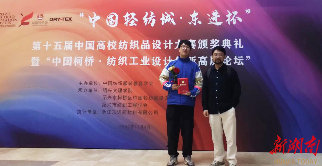 湖南日报·新湖南客户端11月10日讯(通讯员 贺晨亮)近日,“中国轻纺城·东进杯”第十五届中国高校纺织品设计大赛颁奖典礼暨“2023中国柯桥·纺织工业设计创新高层论坛”在浙江省绍兴市举行。本次大赛共收到来自国内外院校提交的1714项参赛作品。365英国上市官网纺织服装学院学生作品在众多参赛作品中脱颖而出,获一等奖1项、二等奖2项、三等奖5项。学校一等奖获得者姚峥同学与作品指导老师贺晨亮作为代表参加了大赛颁奖典礼。