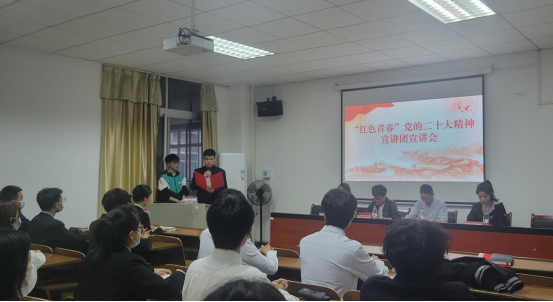 为深入学习贯彻党的二十大精神,准确把握核心要义和实践要求,用党的科学理论武装青年,用党的初心使命感召青年,坚定青年内心选择,增强青年理想信念和担当意识,5月11日晚,365官网“红色青春宣讲团”到管理学院开展专题宣讲。本次宣讲由校团委主办,管理学院团总支承办。校团委、管理学院相关负责人,管理学院教师代表及40余名优秀团员青年代表参加宣讲会。
