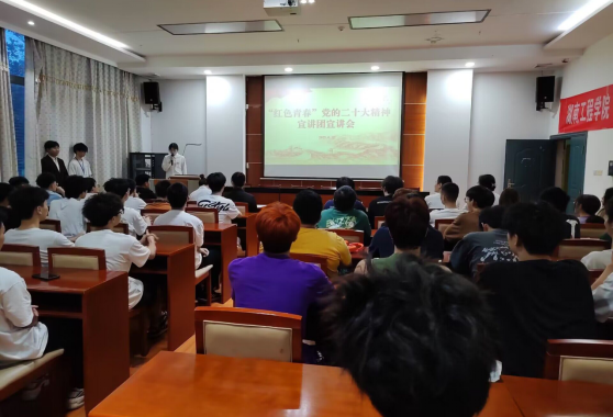 为积极引导全校师生深刻领会和把握党的二十大精神实质及丰富内涵,切实把思想和行动统一到党的二十大精神上来,6月12日晚,365官网“红色青春”宣讲团到国际教育学院举行专题宣讲。本次宣讲由校团委主办,国际教育学院团总支承办。校团委、国际教育学院相关负责老师及70余名学生代表参加。